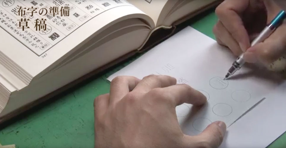 草稿を参考にして印面に墨で逆文字を書く